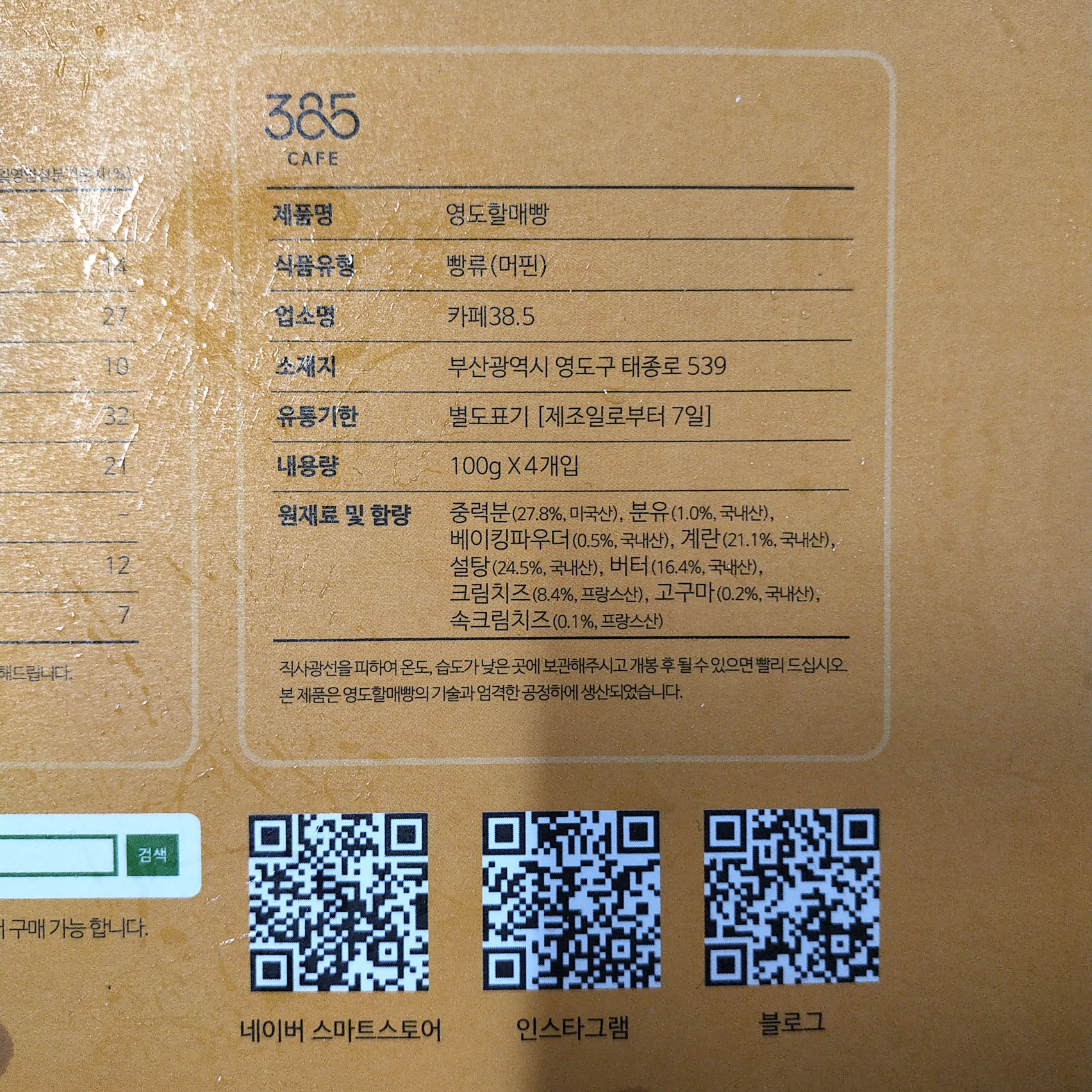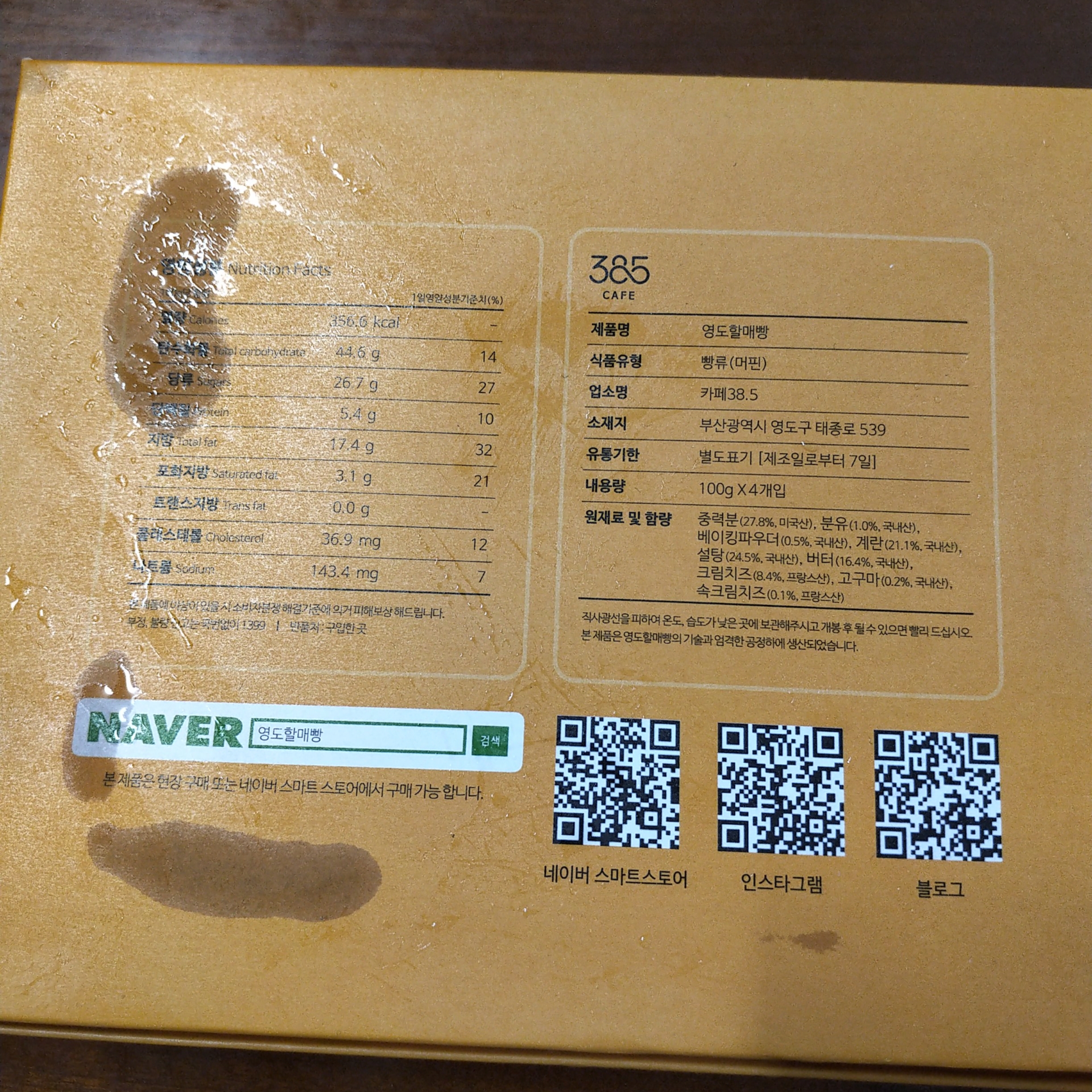 머핀 1개가 100g이니까.. 하나 당 356.6 칼로리네요 ㅋㅋㅋ