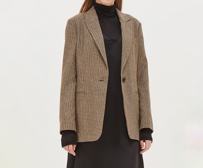 베이지 브라운 컬러감의 잔체크 자켓으로