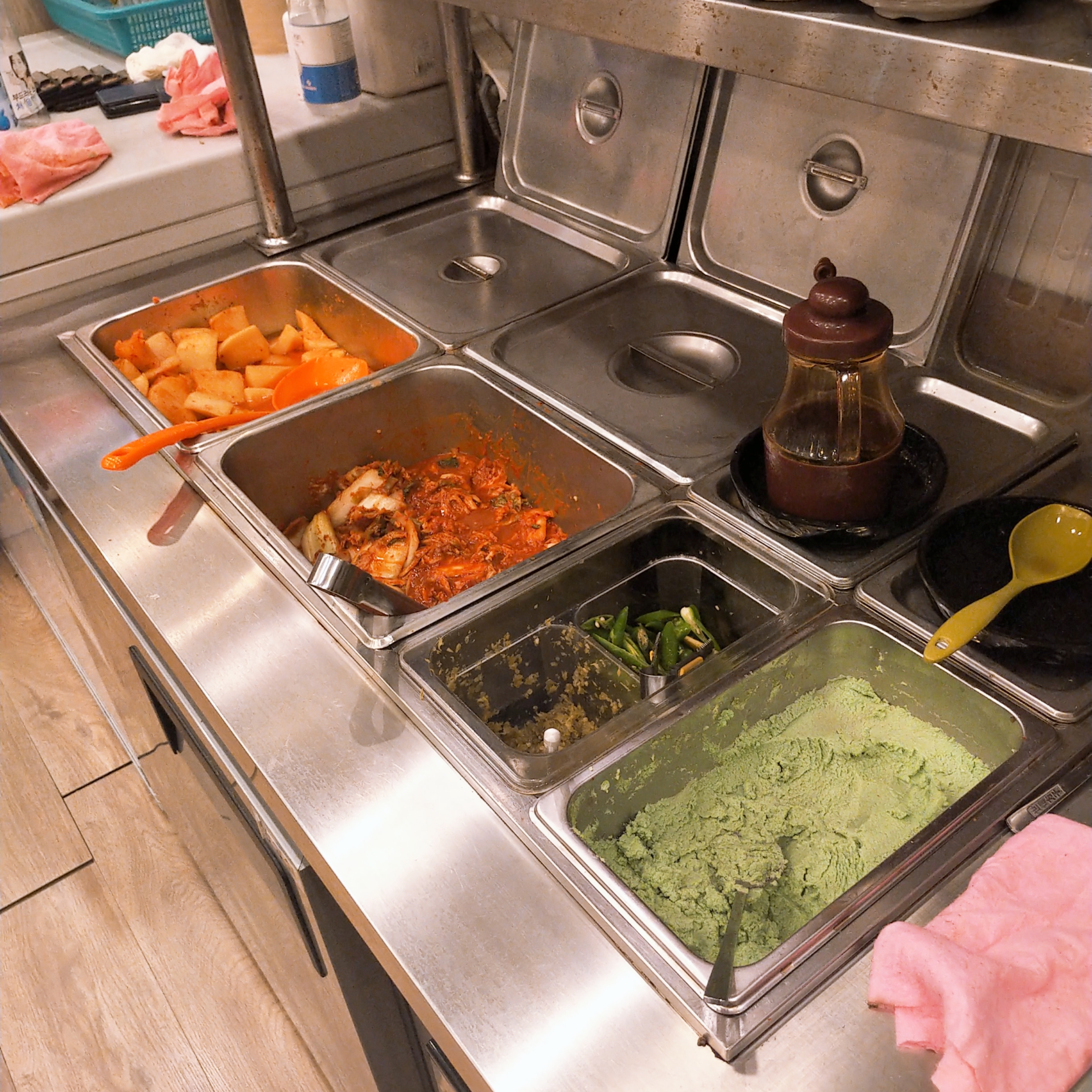 셀프바에는 겉절이, 깍두기, 절임고추, 청양고추, 와사비 등이 있습니다.