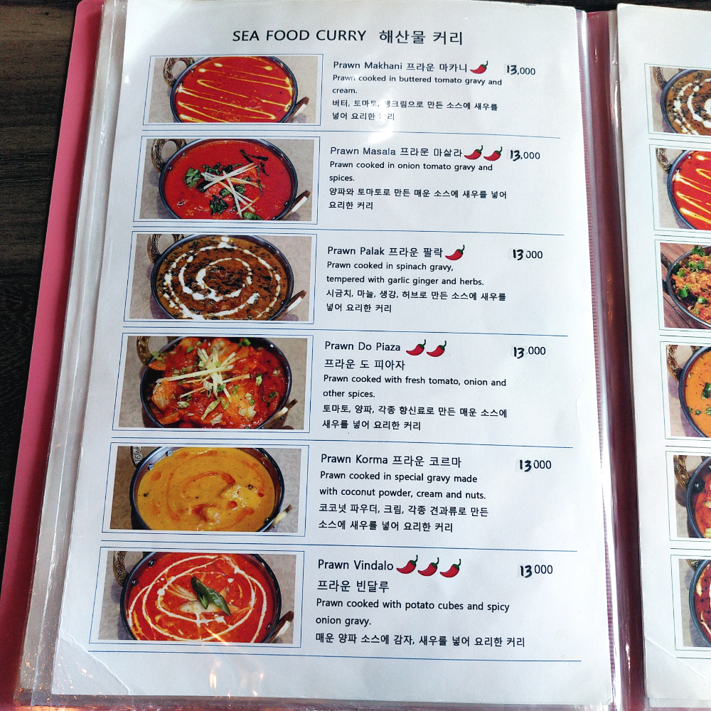 커리만 해도 치킨 커리, 해산물 커리, 야채 커리, 양고기 커리가 있는데요, 또 각각에는 6 종류씩 커리가 있어요!!