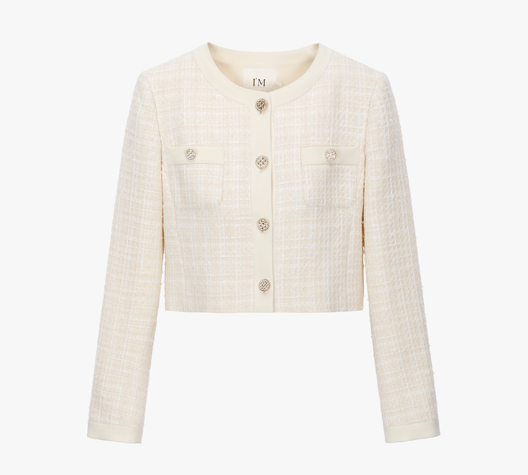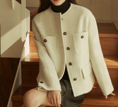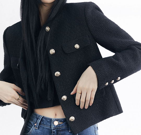 기본 라운드넥 디자인이어서 얼굴형 상관 없이 무난하게 어울리는 스타일이며, 트위드 재킷의 포인트라고 할 수 있는 단추도 디테일이 세심하게 들어가서 고급스러워보여요.