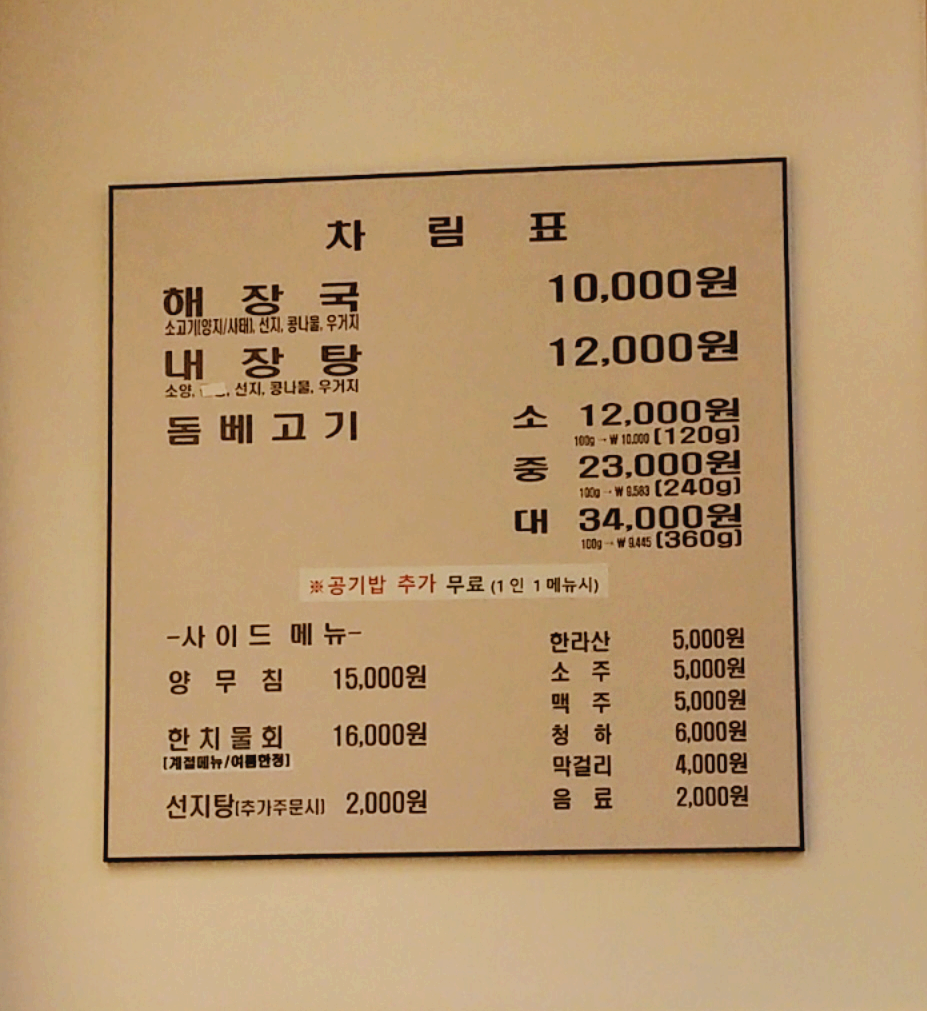 해장국 10000원, 내장탕 12000원, 돔베고기 소/중/대 12000/23000/34000원이에요.