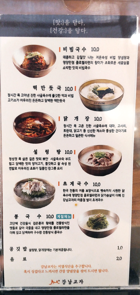 칼국수, 얼큰칼국수 / 얼큰수제비, 들깨수제비 / 비빔국수 / 떡만둣국 / 닭개장 / 설렁탕 / 초계국수 / 콩국수