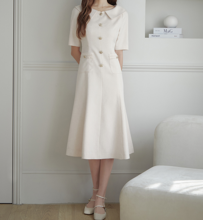 지컷 원피스 중에서는 카라 넥 티어드 원피스를 가장 추천드립니다.