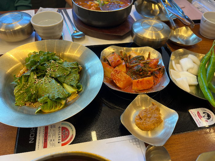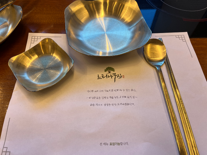 앞접시와 숟가락, 젓가락 모두 유기 수저여서 고급스러운 느낌이 가득한 식당이에요.