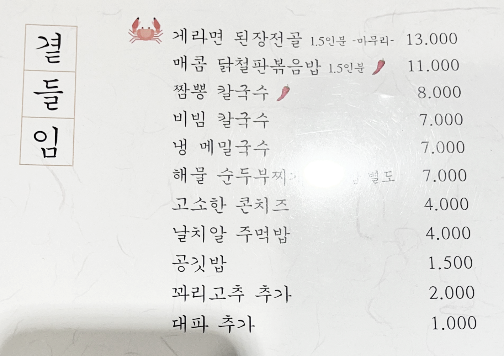 다른 식사류는 게라면 된장전골, 닭철판볶음밥, 칼국수, 메밀국수, 순두부찌개가 있어요.