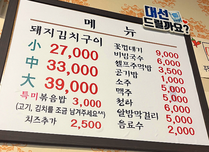 돼지김치구이가 메인이고, 가격은 소 27000원 중 33000원, 대 39000원이에요.
