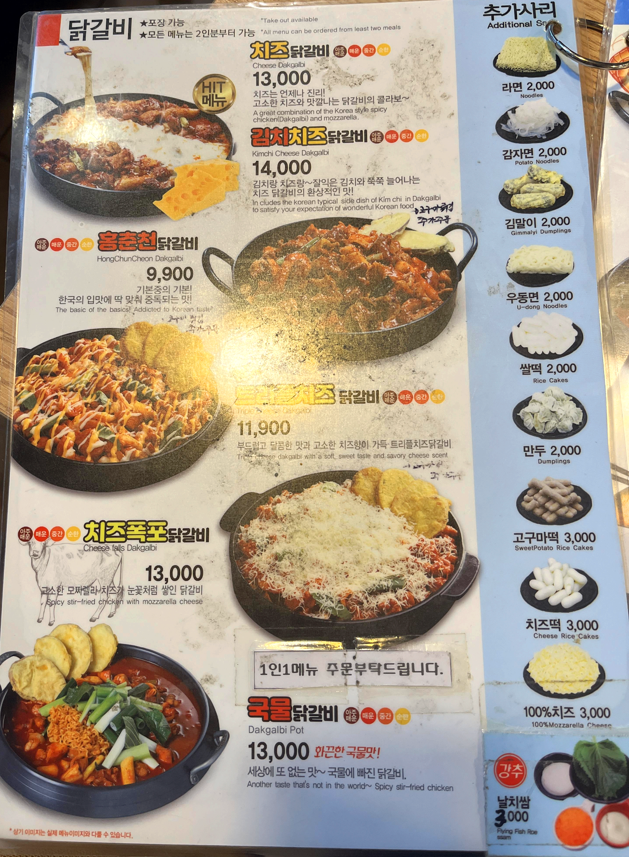 홍춘천닭갈비 메뉴판
