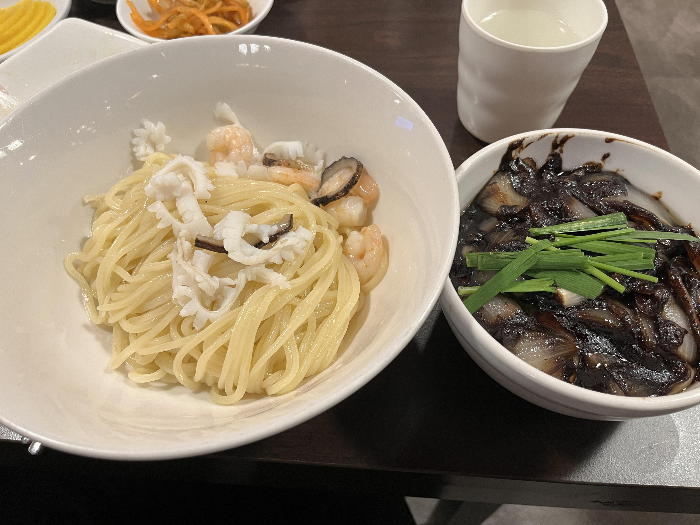 면발에 해물이 올라가 있고, 짜장이 따로 나와요. 부추도 올라가 있는 것 같네요.