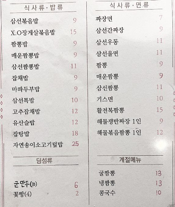 해물 쟁반짜장, 볶음짬뽕, 잡채밥, 유산슬밥, 굴짬뽕 등등 다양한 중식 메뉴가 있어요.