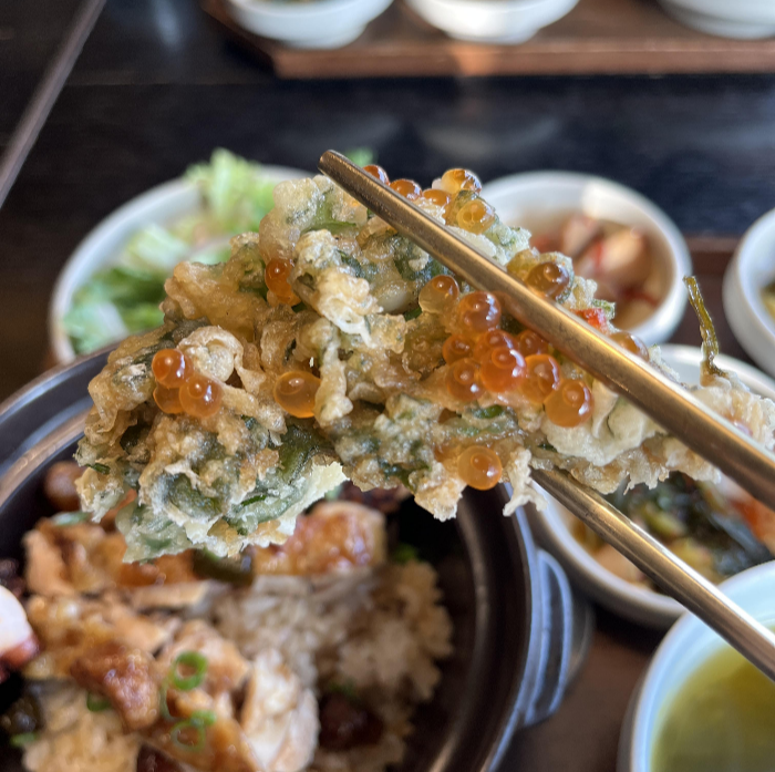 연어알장의 짭조름한 맛과 나물 튀김이 정말 잘 어울렸어요.