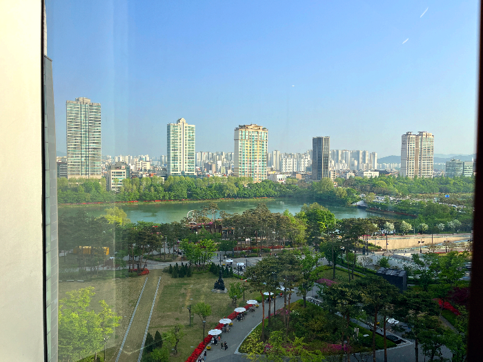 석촌호수 뷰가 보이는 창가 자리에 앉았어요.